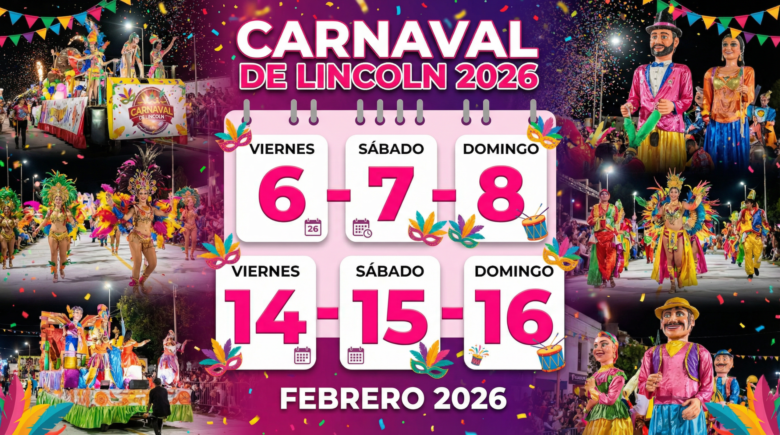 La próxima edición del Carnaval de Lincoln, prevista como es habitual para el mes de febrero, volverá a desplegar corsos nocturnos, carrozas monumentales, cabezudos, máscaras sueltas, batucadas, comparsas invitadas y espectáculos musicales en vivo. Durante varias noches, miles de visitantes llegan desde distintos puntos del país para disfrutar de una fiesta que combina creatividad popular y espíritu comunitario.