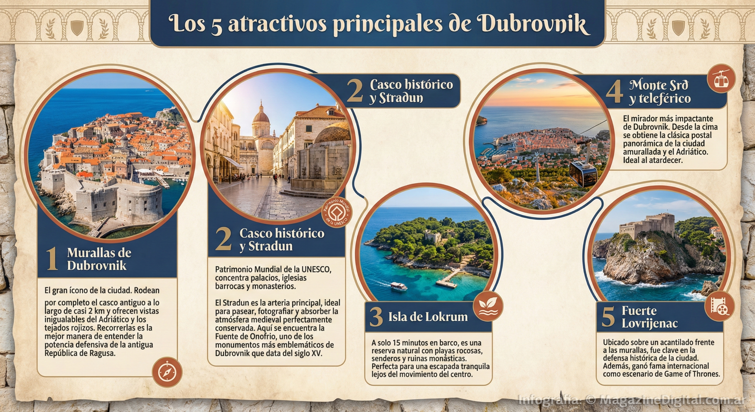 Las murallas de Dubrovnik, que rodean completamente la ciudad antigua, se extienden por casi 2 kilómetros y alcanzan hasta 25 metros de altura en algunos sectores. Desde allí se obtienen vistas panorámicas del Adriático y de los tejados rojizos que caracterizan la postal clásica de la ciudad.