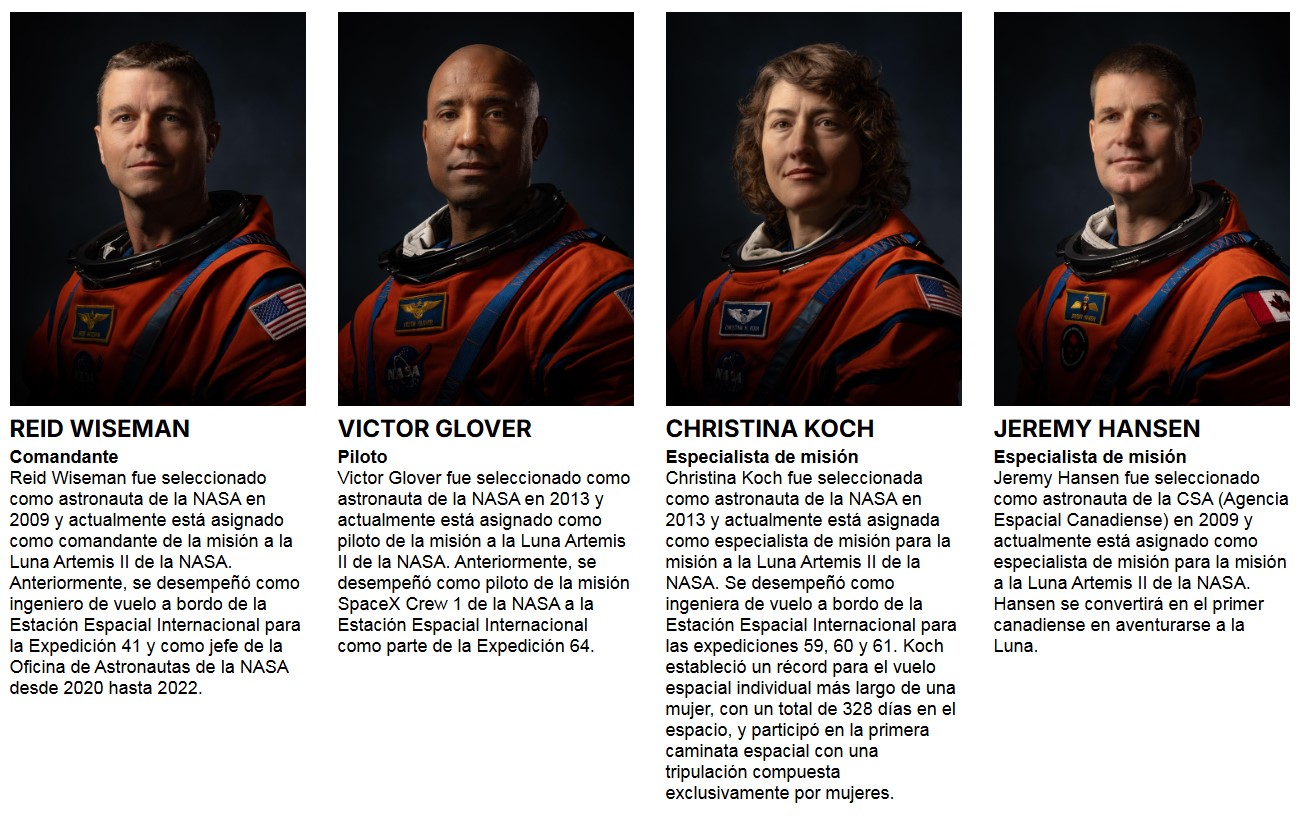 - La Tripulación: A bordo viajarán el comandante Reid Wiseman, el piloto Victor Glover, la especialista de misión Christina Koch (quien posee el récord del vuelo espacial individual más largo hecho por una mujer) y el especialista Jeremy Hansen (el primer canadiense en aventurarse a la Luna).